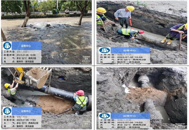 7月6日上午10點20分,客服人員接到群眾的熱線電話,告知清河路清河庭院附近路面大量跑水,運維中心搶修人員接到消息迅速前往,十五分鐘到達現(xiàn)場,通過專業(yè)技能和判斷,確定為DN400主管道爆破,測漏人員立即協(xié)助精準定位漏點,盡量減少開挖面,為搶修爭取時間,該管道會直接影響周邊黃龍五隊、清河庭院、東方小區(qū)、楚苑小區(qū)、雙橋家具大市場等小區(qū)和企業(yè)大面積水小或停水??崾铍y耐,為盡快解決群眾用水問題,維修人員在35°高溫下連續(xù)奮戰(zhàn)8小時,于當晚7點30分恢復正常供水,及時避免了周邊居民下班后正常生活用水的問題。